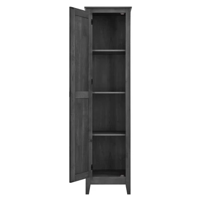 The Room & Joy Brookside 18” Wide Storage Cabinet is a stylish way to stay on top of your organization. The rustic barn style design and sleek tapered feet gives the look of an old weathered cabinet but the sturdy laminated particleboard and MDF make this cabinet the perfect piece to house your home office supplies, extra linens, seasonal clothing, nonperishable food and more! Open up the door to 4 spacious shelves, 2 adjustable, to fit items of differing sizes. The door can be assembled on either the left or right side so you can arrange your room however you need. The Brookside Cabinet is recommended to be assembled and moved by 2 adults. A wall anchor kit is provided for extra safety and security. After assembled, this cabinet measures to be 71.89”H x 18.19”W x 15.67”D.