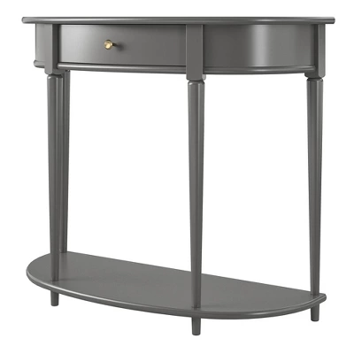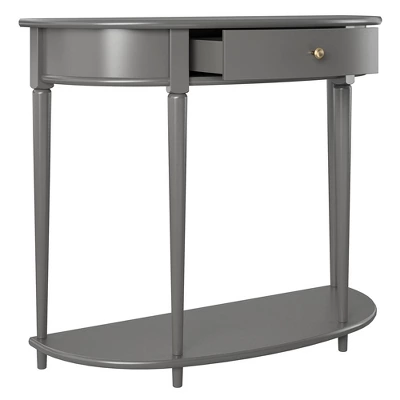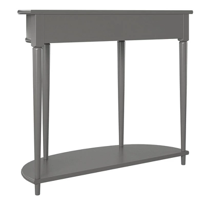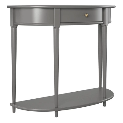 Give your living room or entryway a glow-up with a beautiful new Half-Moon Console Table. The classic elegance of the half-moon top and tapered legs create a vintage yet sophisticated feel perfect for any dĂ©cor. This half-moon Console Table features a spacious drawer to keep clutter out of sight and a lower shelf for books, photos, or other decorative items to cozy up the room. Made sturdy painted MDF, the Console Table is as durable as it is affordable and assembly is a snap! With the preassembled tabletop and drawer all ready to go right out of the box, just attach the legs and bottom shelf, and you’re off to more important things, like basking in the ambiance of a well decorated room. Complete the look with the entire collection. The Console Table ships flat to your door in one box. Assembly is required. Two adults are recommended to assemble. Once assembled, the Console Table measures to be 35.9″ W x 14″ D x 30″ H.
