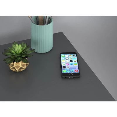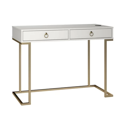 Enhance your space like a boss with the Room & Joy Kaylee Writing Desk. Made of laminated MDFand particleboard with powder-coated metal, the clean finish complements the gold legs and drawer pulls for a trendy look. Wireless charging spot on the desktop allows you to re-charge your smartphone without the hassle of cords. The 2 drawers are perfect for extra office supplies, stationary, and stamps. Complete your room with other items from Room & Joy (sold separately). The Writing Desk ships flat to your door and 2 adults are recommended to assemble. The desktop can hold up to 80lbs. and each drawer will hold 5lbs. Assembled dimensions: 30.9″H x 41.6″W x 19.7″D. The Manufacturer warrants this product to be free from defects and agrees to remedy any such defect. This warranty covers one year from the date of original purchase.