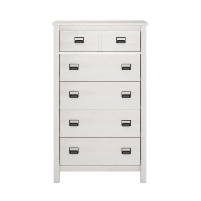 Keep your clothes from piling up by using the Room & Joy Melody 5 Drawer Dresser. The classic woodgrain finish on the laminated MDF and particleboard pairs with the decorative side panels for a beautiful mission style piece you will enjoy for years to come. The top drawer front features detailed grooves for the look of 2 drawers but is spacious enough to store your folded clothing. Organize T-Shirts , pants, pajamas, and extra sheets in the 5 drawers with durable metal slides for a smooth and easy gliding drawer. The linen-look paper on the inside of each drawer prevents clothes from snagging on raw edges and gives the Dresser a completed look. A wall anchor kit is included to secure the Dresser to the wall and prevent tipping injuries. The Dresser ships flat to your door and requires assembly upon opening. Two adults are recommended to assemble. Once assembled, the Dresser measures to be 53.05″H x 31.77″W x 18.62″D.