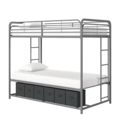 Make the most out of a small footprint with the Room & Joy Betony Twin/Twin Bunk Bed with Storage Bins. This bunk bed is the ultimate in-space saving design for every growing family with limited floor space. Designed with a modern flair, its clean-lined silhouette perfectly matches any décor. The bedframe is constructed with a sturdy metal frame with full-length guardrails, 2 integrated ladders and secured metal slat base that ensures stability for the sleeper and air circulation for the mattress. Designed to accommodate 2 twin mattresses (sold separately) and no foundation required, just top each bunk with mattresses and sleep the night away. What’s more, the under-bed clearance is fully optimized with six handy containers that provide you ample storage for the kids’ books, toys, and extra clothes. The Room & Joy Betony Twin/Twin Bunk Bed will accompany your little ones through their growth and learn for years to come!