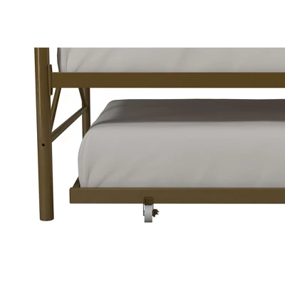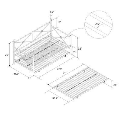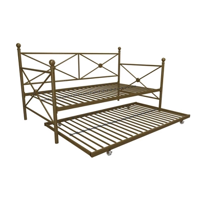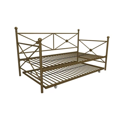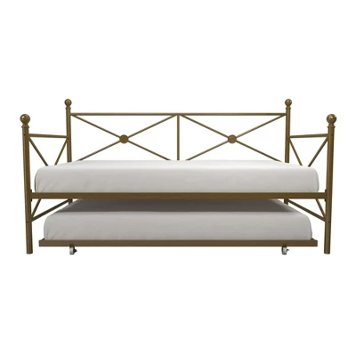 Optimize your living space with the Room & Joy Laura Daybed and Trundle as it comes with an ultra-chic design and great functionality. This metal bedframe features an elegant design with crisscross metal, highlighted with a circular medallions and round finial posts. Built with a sturdy frame, this daybed comes with secured metal slats that ensure stability and durability. Having guests stay over? This piece includes a trundle that rolls out and creates yet another bed! Accompany it with some duvets and soft throw pillows, and it will be converted into a comfy lounging for your living room. Available in classic black and gold, the Laura Daybed and Trundle will compliment any interior.